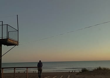 con los pies sobre la arena húmeda,